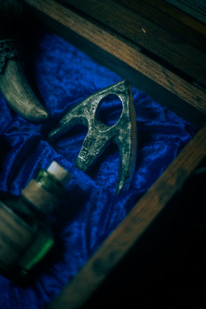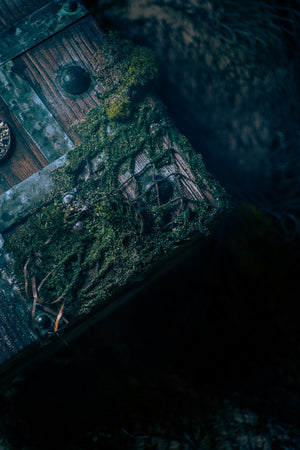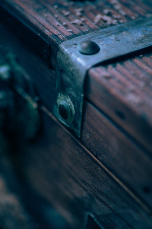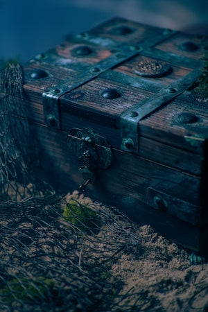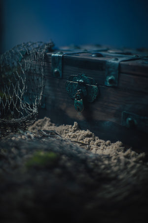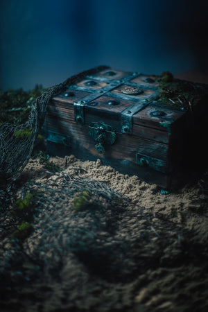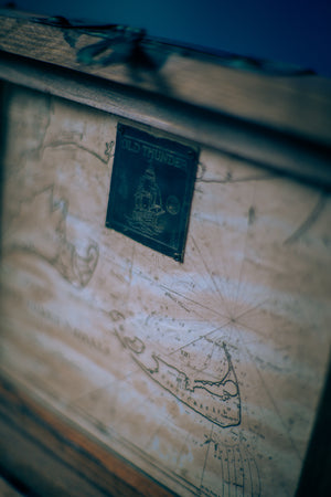 Within its velvet-lined ark, hewn and finished by hand in our own shipyard at The Holy Black,rests a sailor’s bounty fit for the deck of the Pequod. Each chest bears an etched brass nameplate, anantique map of Nantucket beneath the lid (as though guiding its owner forever homeward), and a custom pewter coin, nailed in proud homage to that bright gold piece Ahab once struck to the mast, his solemn vow of pursuit.
