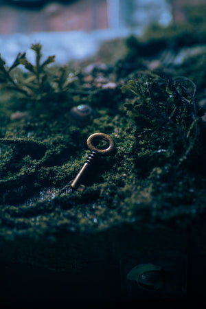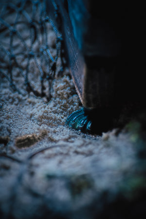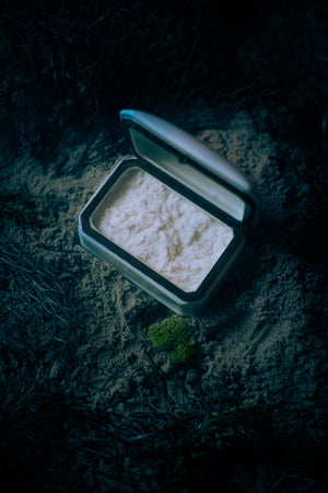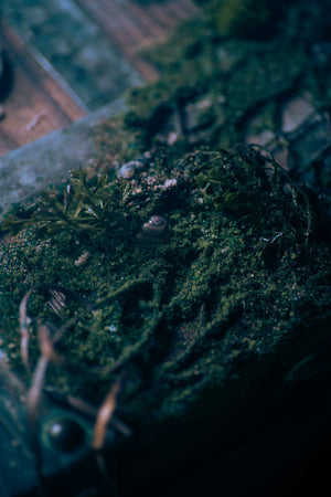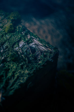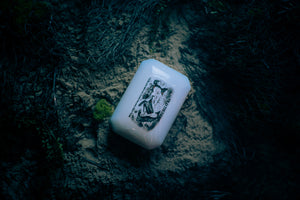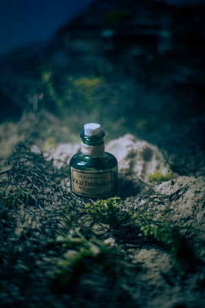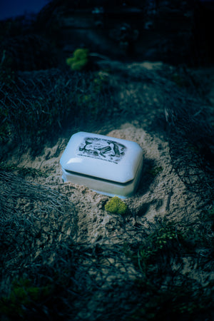 Inside lies the Aftershave of the Deep, contained within a recycled glass bottle, corked like a message adrift upon forgotten tides, adorned withhandmade paper labels whose texture recalls the logbooks of doomed whalemen. Its fragrance; briny, dark, and redolent of oak and smoke, lingers like the memory of the sea.
