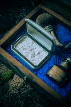 Beside it, the Shaving Soap of Nantucket lies entombed within a porcelain vessel, its lid bearing a woodcut of a whaling scene, the chase eternalized in black ink and foam. Two hundred and fifty grams of hot-processed might, ready to raise a lather as dense as ocean mist and as pure as the marrow of the whale.